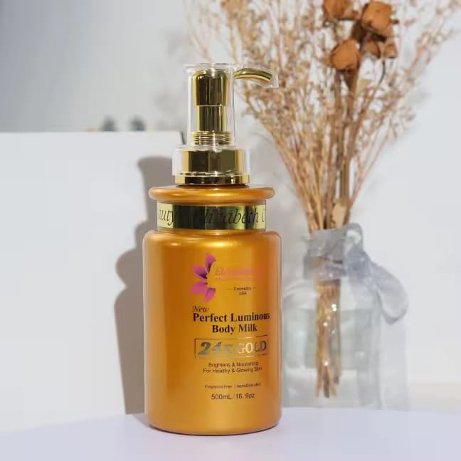 Elizabeth O Beauty 24k gold Perfect Luminous Body Milk is specifically formulated for delicate/sensitive skin type with a fragrance free formula. This lotion effectively brightens. moisturizes, fades dark spots, and rejuvenates the skin cells when used consistently.