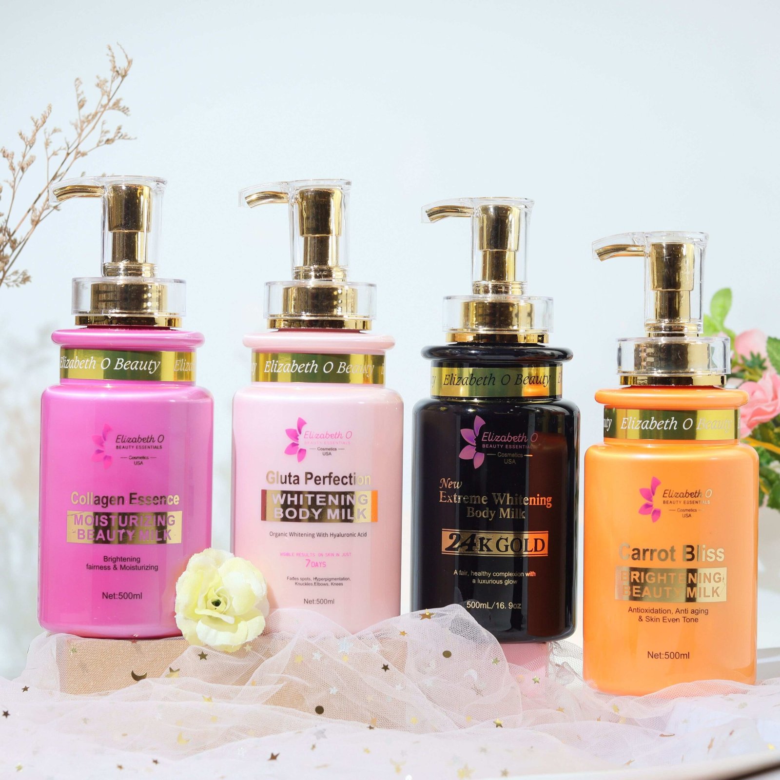 Choose from four ingredient powered body milks including 24K Gold, Gluta Perfection, Collagen Essence, and Carrot Bliss, each designed to brighten skin, fade dark spots, smooth texture, and deeply hydrate for healthy radiant results.