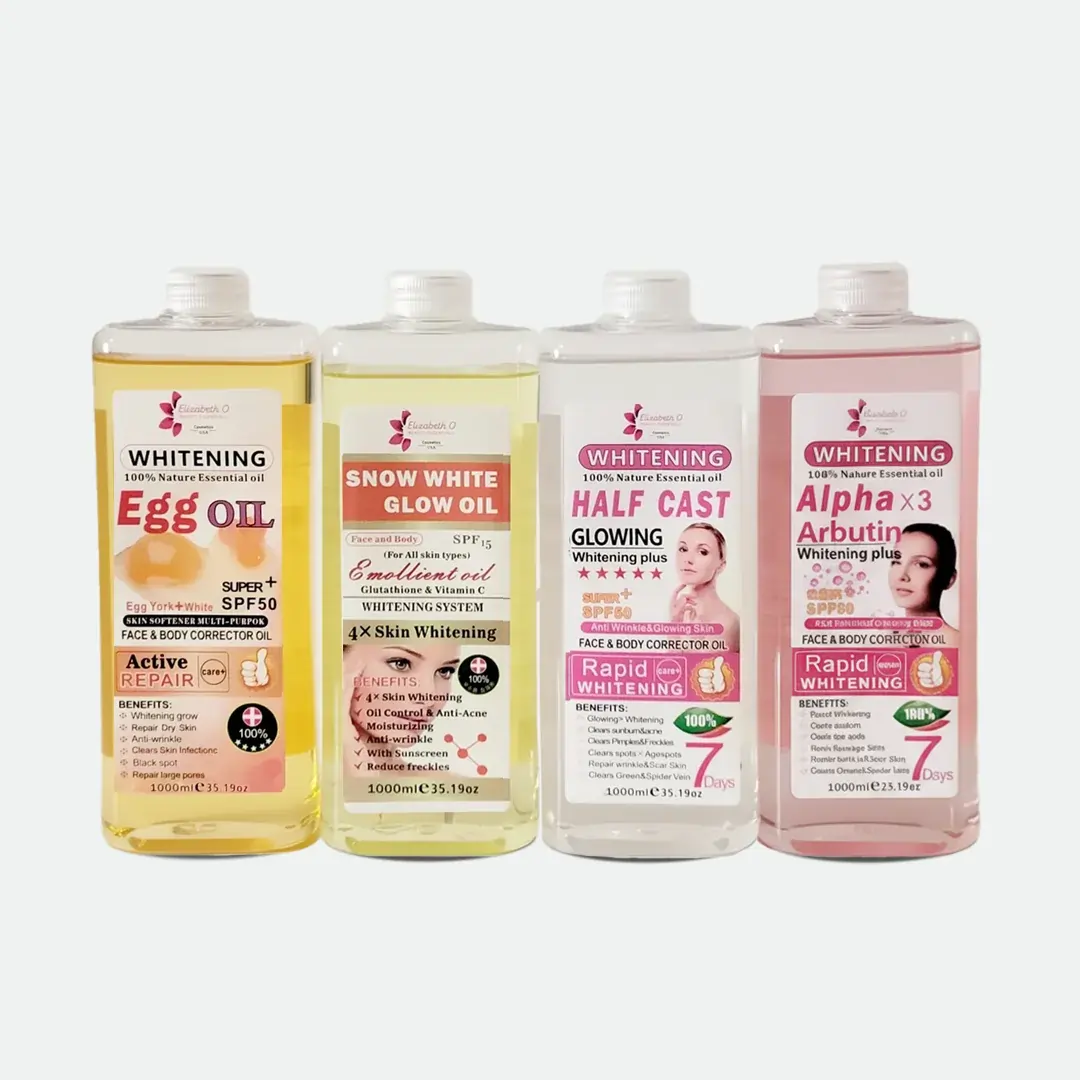 Whitening Body Oils Bundle includes 4 different extremely effective brightening Lightening and Whitening Oils with 1000ml each.
