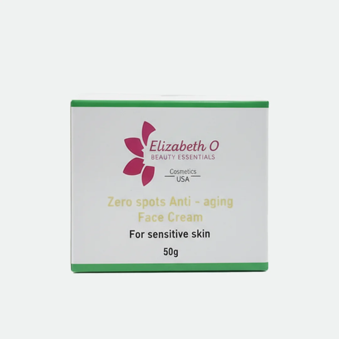 Elizabeth O Beauty Zero spots Anti aging face cream is enriched from exquisite and powerful ingredients that also remove dark spots (from acne and hyperpigmentation) . it contains vitamin C & E and provides an SPF of 15. This product will nourish and refine skin, lighten dark spots, and smooth pores. This product has been formulated for sensitive skin.